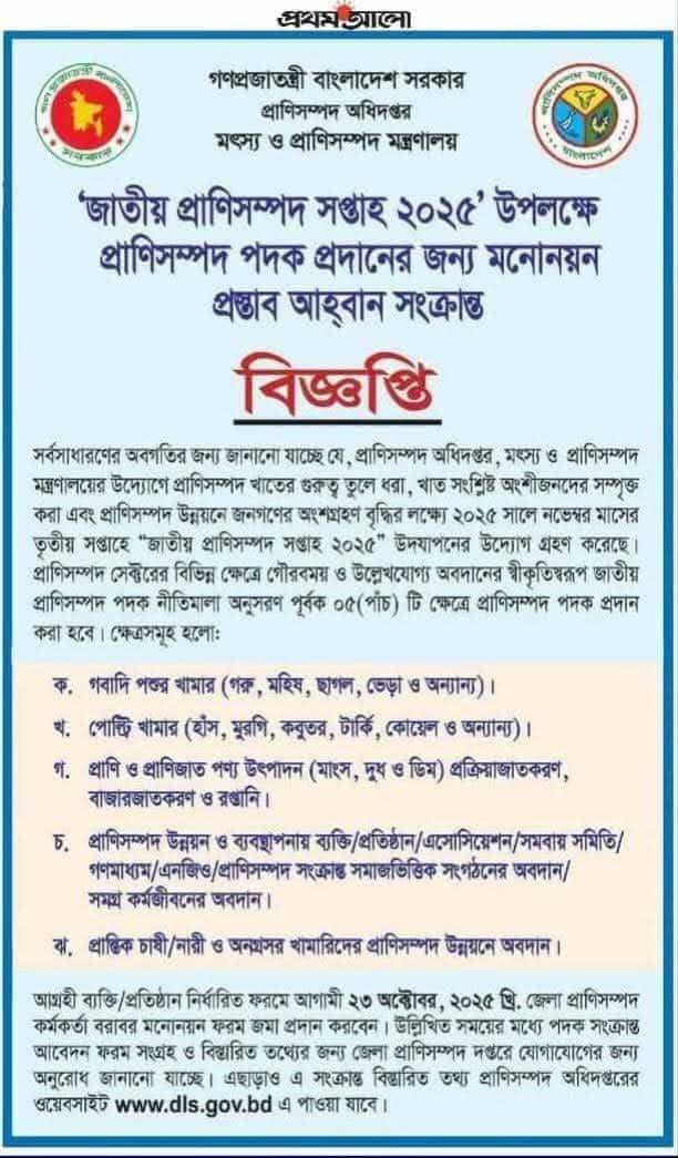 | ১ | 'জাতীয় প্রাণিসম্পদ সপ্তাহ ২০২৫’ উপলক্ষে প্রাণিসম্পদ পদক প্রদানের জন্য মনোনয়ন প্রস্তাব আহ্বান সংক্রান্ত বিজ্ঞপ্তি | | ২০-১০-২০২৫ | দেখুন | |